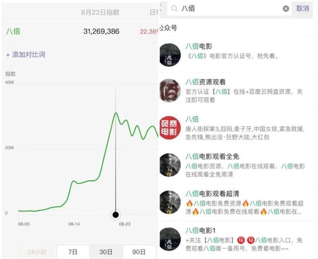 比如,上映19天票房24亿的电影《八佰》,众星云集,票房给力。3000万+的微信指数同样恐怖,这样的热度不去蹭一下是不是太可惜了?